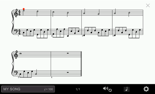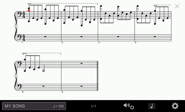 Also, be aware that after you record the MIDI piece with a metronome, all the notes will be crowded together on the top stave of the displayed score. This is because when you record a MIDI file in the Clavinova, under default conditions, the Clavinova records all notes (both hands) to MIDI channel 1, which is normally assigned to the top stave and assumed to normally be just for the right hand. Since nothing was recorded to channel 2, there are no notes on the bottom stave, which is normally assumed to be the left hand:
